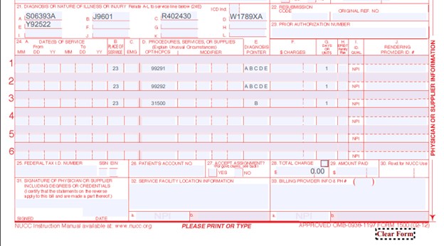 We use the classic, red-ink CMS-1500 form in our exercises because it is the absolute best visual tool to learn where coding data belongs and how procedures link to diagnoses.